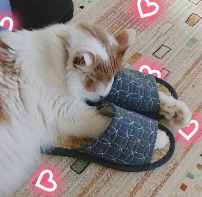 おうちでのひとコマ。 お父さんのスリッパに手を突っ込んで寝ています😂 これが安心するんだとか。。笑